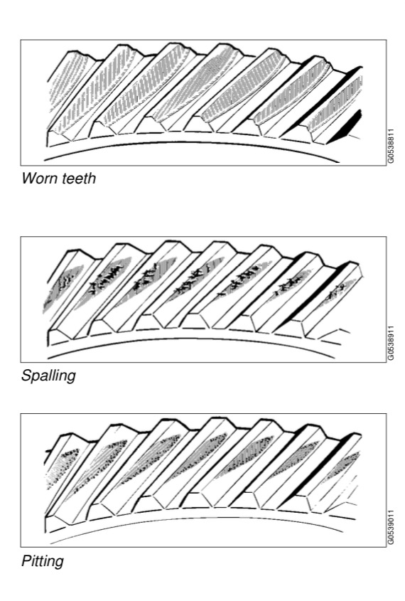 Small bits of the teeth have broken off, so-called spalling. This is generally due to excessive load or improper lubrication. Damage of this type need not necessitate immediate replacement, but careful checking at short intervals is imperative.