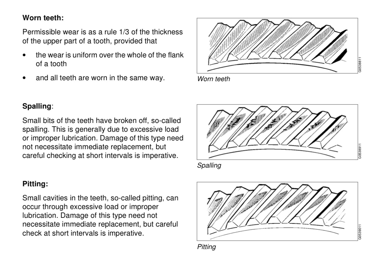 Small cavities in the teeth, so-called pitting, can occur through excessive load or improper lubrication. Damage of this type need not necessitate immediate replacement, but careful check at short intervals is imperative.
